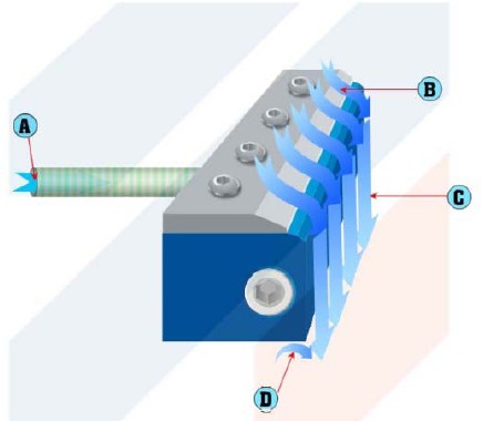 (C)带入气流与压缩空气混合向前形成强大吹扫气流。放大气流为片状层流,在吹除和冷却过程中可减少能源使用。