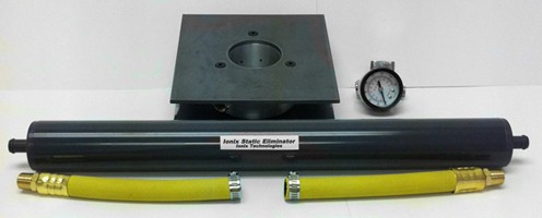 Ionix给料机料斗静电消除器使用压缩空气和一个Ionix静电消除盒。压缩空气须经气流调压器(Ionix供应)调压后连接到Ionix静电消除盒。Ionix静电消除盒出口连接到给料机料斗。